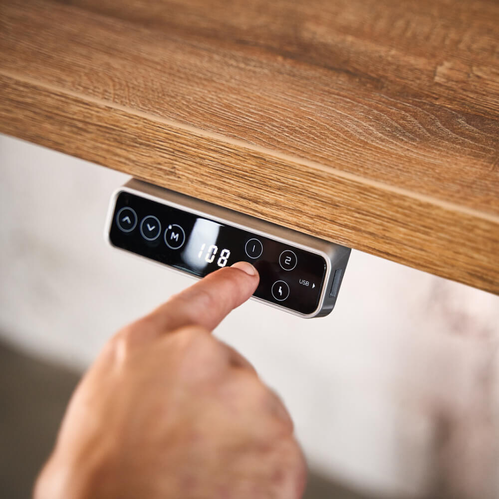 Der Tisch merkt sich die Einstellungen (drei Höhenpositionen), auch wenn er vom Stromnetz getrennt ist