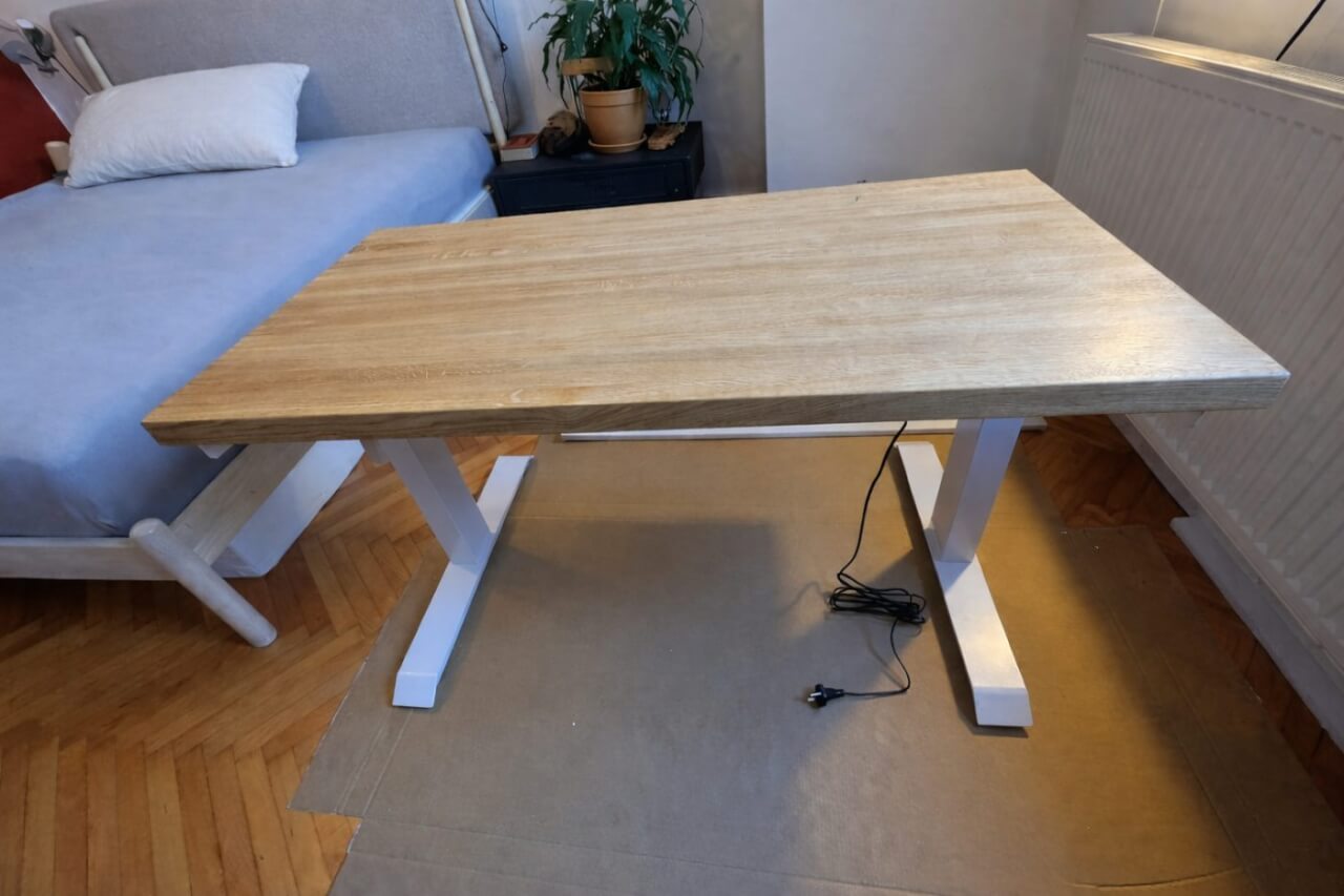 Der Zusammenbau des Tisches dauerte etwa einen halben Tag (ca. 6-8 Stunden), vom Auspacken über den Zusammenbau der Beine, das Ausdenken der Kabelhalterung, das Zentrieren der Beine auf der Tischplatte auf wenige Zehntelmillimeter genau (ich möchte nicht, dass der Tisch schief steht), bis hin zum Befestigen aller Teile an der Tischplatte mit einem Schraubenzieher, dem Aufstellen, dem Ausbalancieren des Tisches und dem Ausprobieren. Am Ende funktionierte alles beim ersten Versuch. Der Tisch erinnert sich sogar an alles Einstellungen, auch wenn er nicht ans Netz angeschlossen ist - Waschmaschinen und Geschirrspüler könnten sich daran ein Beispiel nehmen! :-)