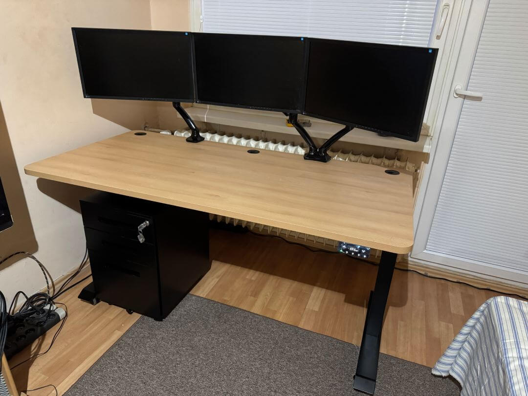 Der Zusammenbau des Tisches dauerte etwa einen halben Tag (ca. 6-8 Stunden), vom Auspacken über den Zusammenbau der Beine, das Ausdenken der Kabelhalterung, das Zentrieren der Beine auf der Tischplatte auf wenige Zehntelmillimeter genau (ich möchte nicht, dass der Tisch schief steht), bis hin zum Befestigen aller Teile an der Tischplatte mit einem Schraubenzieher, dem Aufstellen, dem Ausbalancieren des Tisches und dem Ausprobieren. Am Ende funktionierte alles beim ersten Versuch. Der Tisch erinnert sich sogar an alles Einstellungen, auch wenn er nicht ans Netz angeschlossen ist - Waschmaschinen und Geschirrspüler könnten sich daran ein Beispiel nehmen! :-)